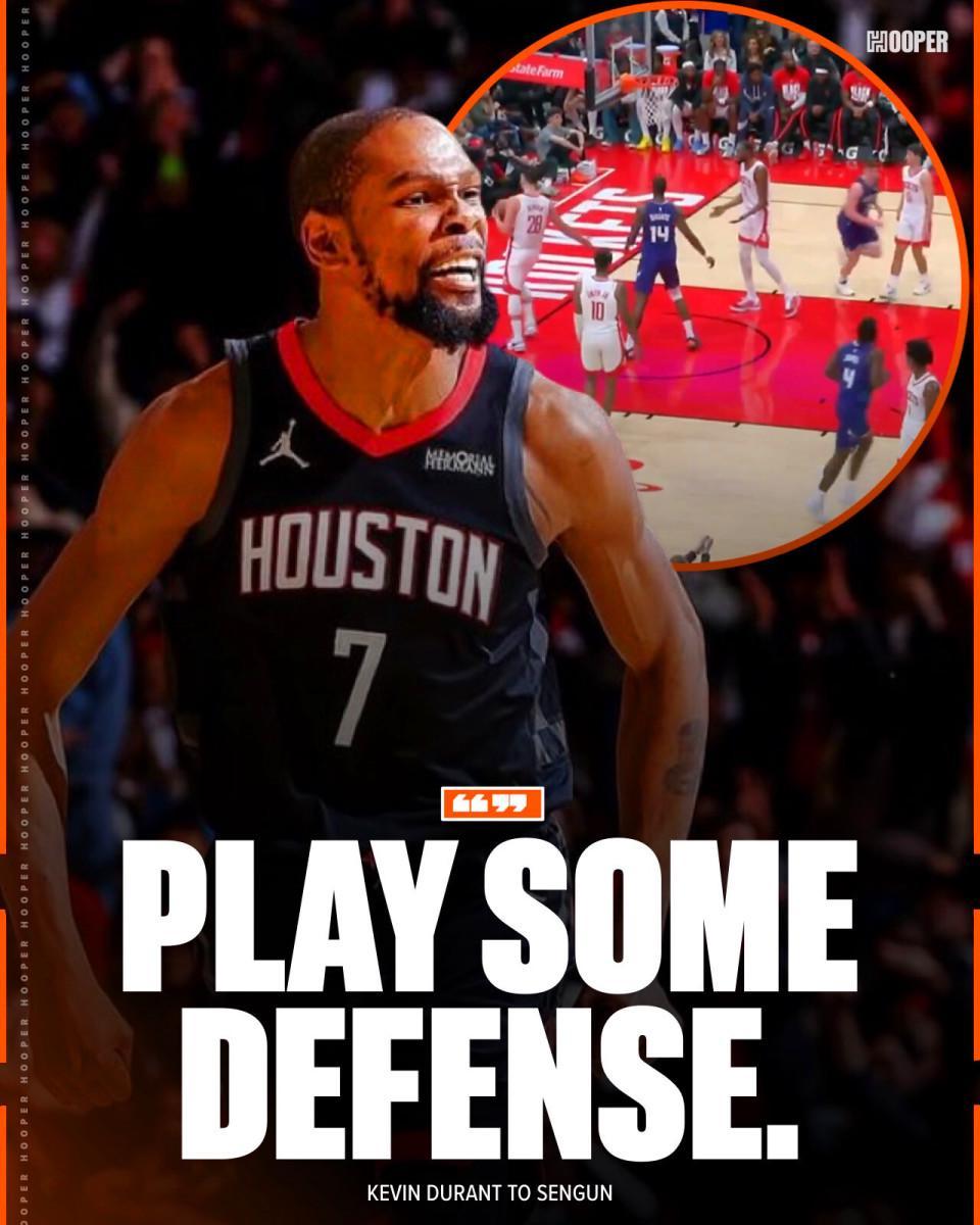 这一幕出现在比赛第三节,申京被克尼佩尔轻松一步过掉上篮,一旁的杜兰特直接摊手抱怨道:“PLAY SOME DEFENSE(你倒是防一下啊)。”