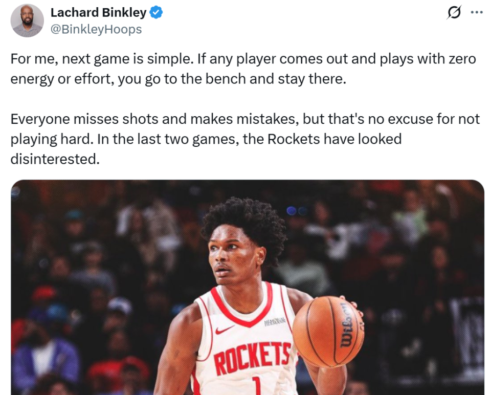 赛后火箭随队记者Lachard Binkley也不禁吐槽道:“投篮失准和失误都可以接受,但绝没有不努力的理由,下一场的要求就是有球员上场后毫无能量、毫无拼劲,那就直接坐冷板凳。”